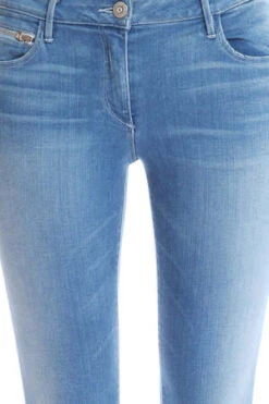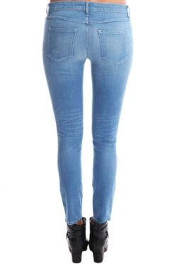 A light wash with a front zip pocket and whiskering on the hips. A great skinny fit from waist to ankle.