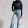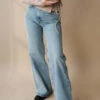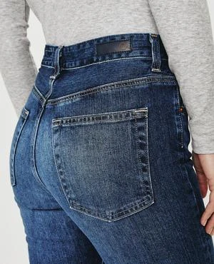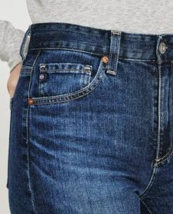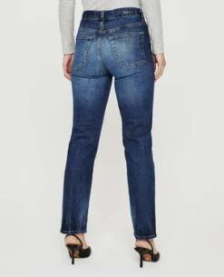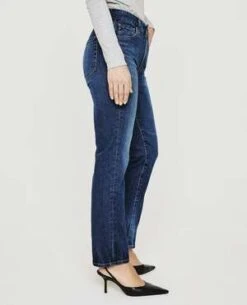 Saige is a women’s high-rise straight jean, featured here in a dark blue wash with a faded finish. This high-rise straight is designed in 11 oz. Lead Denim, a stretch-cotton blend for comfortable everyday wear. Saige is complete with a zip fly, angled yoke, and slightly forward side seams.