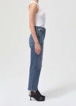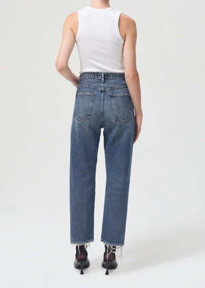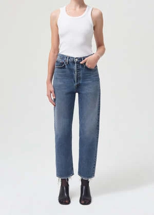 Agolde 90’s crop loose jeans in medium blue oblique. A cropped version of the iconic 90’s jean. This decade inspired mid-rise is designed to sit relaxed on the waist with an eased up fit through the body. Non stretch denim. Button fly.