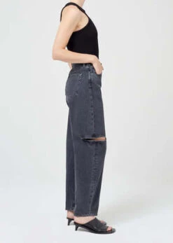 Agolde Sanna slice high rise jean in washed black percolate. This statement fit is cut with a roomy, curved leg and tapered ankle. Sits high on the waist. Button fly.