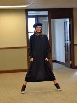 A new shape for Anntian, not as voluminous as the Big Dress, but looser than the Simple Dress. Rounded shoulder / sleeve with gentle gathers. Rear zip. Mid-calf length.