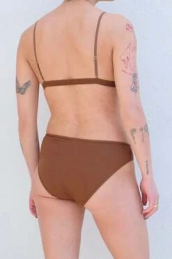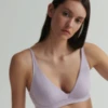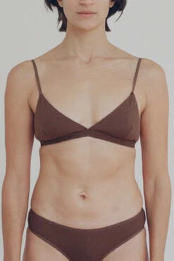 Triangular neckline bra with thin adjustable straps and darted cups. Thin elastic trim at hem. Made from a soft bamboo jersey fabric.