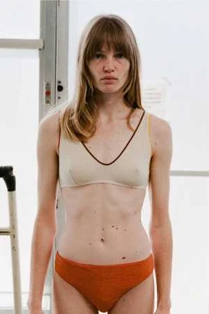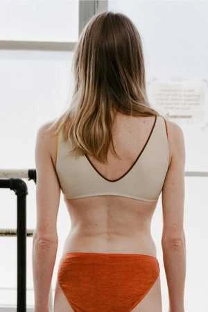 The Pam Bra in Mom Sand by Baserange. A low front and back scoop neck bra. Tonal detailing on elastic band seam. Soft stretch fabric supportive for medium and small bust.
