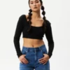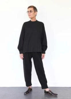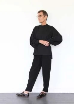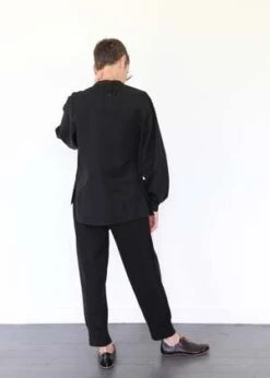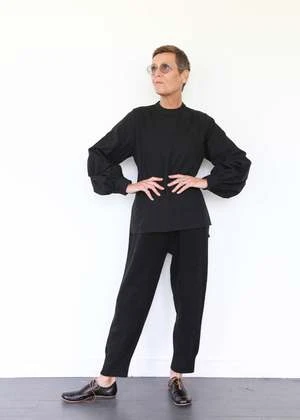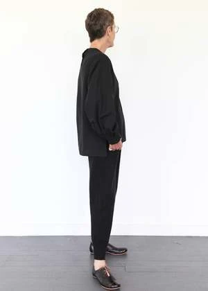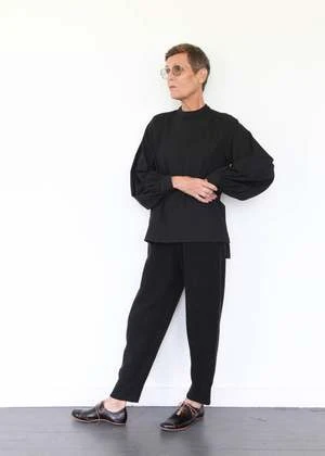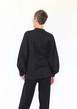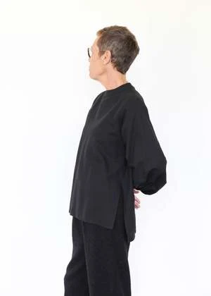 100% cotton twill shirt with puffed sleeves, buttons at back neck and split hem. Made in USA