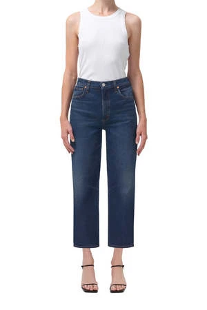 Citizens of Humanity Florence wide straight leg jean in dark blue everdeen wash. The Florence is an easy, mid rise with a straight leg that skims the body. Dark indigo with slight whiskering and subtle fading with a clean hem. Comfort stretch denim with a super soft hand for all day wearability. Button fly.