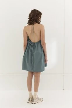 The halter dress is a light weight short length dress features a gathered square neckline with a flattering refined halter neck tie and relaxed low gathered back