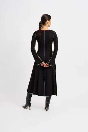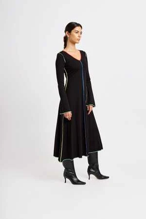 Crafted from thick ponte fabric, the Clara dress in cream features bold multi-colour topstitching. With its classic A-line silhouette and subtly bell-shaped sleeves, this dress is effortless and easy to wear.