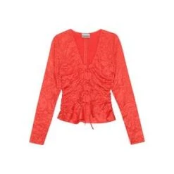 This Red Crinkled Satin V-neck Shirt is made from a blend of recycled polyester. The shirt is designed for a slim fit and features a V-neckline, ruching at the sides, a tie band closure and a crinkled satin look.