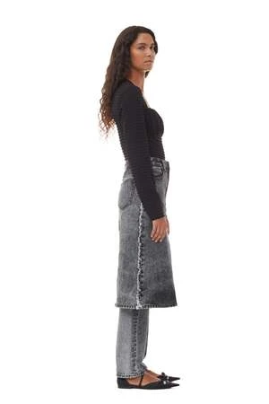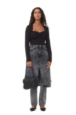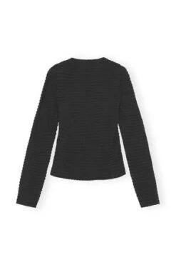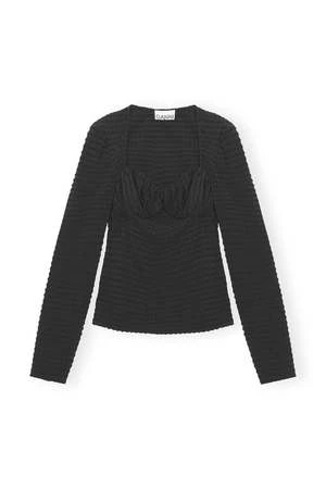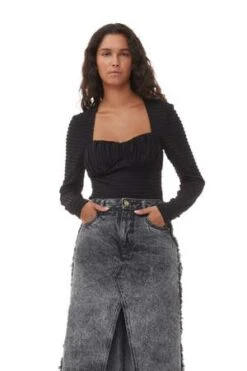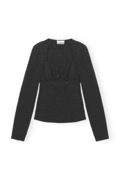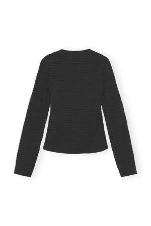 This Black Stretch Seersucker Blouse is made from a blend of recycled polyester. The blouse is designed for a slim fit and features a sweetheart neckline and long sleeves.