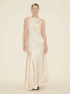 The Daniella Dress in Red Mix by Holzweiler is an asymmetrical, draped dress featuring a tall slit and adjustable string waist crafted in a beautifully draped viscose.