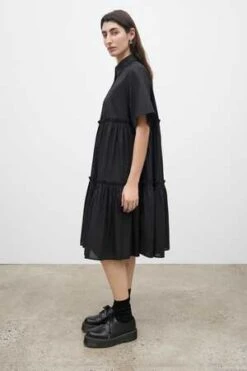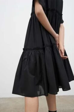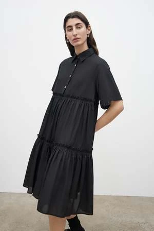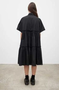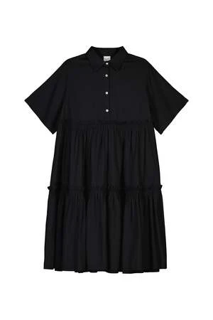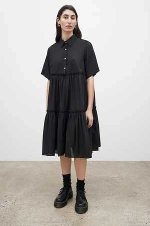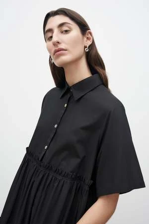 The Jesse is a shirt style dress with an effortless oversized fit made in a lightweight organic cotton voile. It is defined by two gathered tiers that fall to a below the knee length. It features a classic collar and elbow length short sleeves, and is finished with agoya shell buttons.