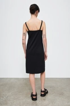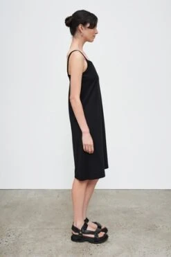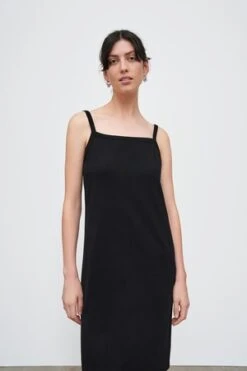 A straight, knee-length slip dress with narrow straps and a square neckline, made from mid-weight organic cotton jersey. The dress has a slim fit through the body and can be worn on its own, or as a layering piece. Featuring our signature twisted side seams.