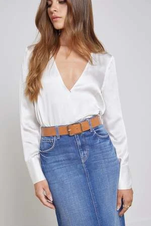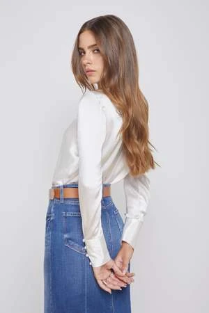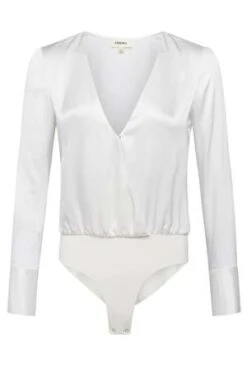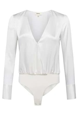 A subtly sexy plunge-neck bodysuit in lustrous ivory silk charmeuse. Crossover-front design includes long sleeves with extended cuffs fastened by self-buttons. Blouse-like silhouette extends into a cheeky laser-cut panty that fastens with a two-snap gusset, creating a smooth, line-free look.