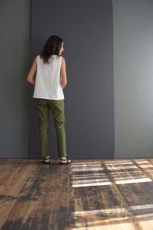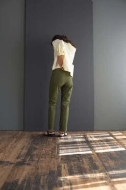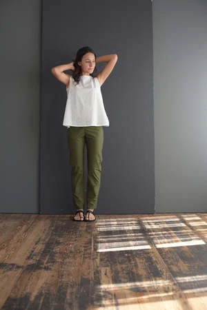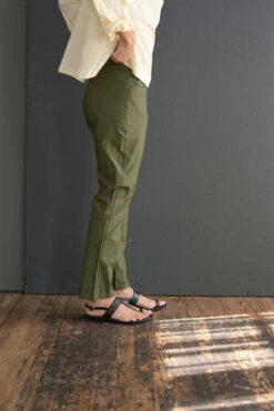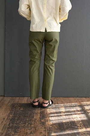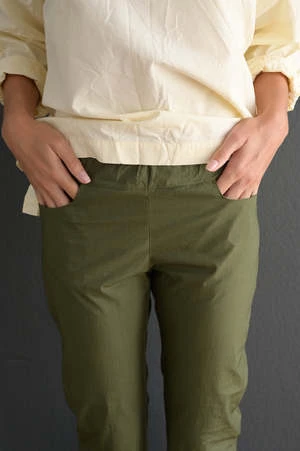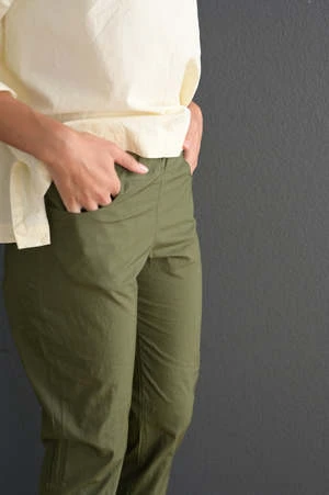 The Labo. Art Mild Pant feature a tapered leg with an elastic waistband and cropped length. Front pockets, no back pockets.