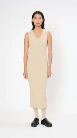 The Rib Tank Dress has a fitted silhouette that falls around the ankles. It’s made of a soft wash wool and alpaca blend with a slight stretch and is finished with binding at the armholes and neckline.