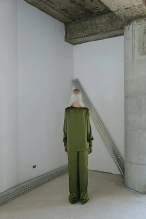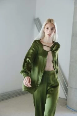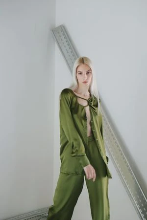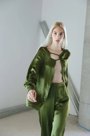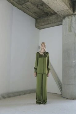 Materials: Olive Green silk, buttons Colors: Olive green : Trousers Fluid tailored trousers in olive green silk with two side pockets Shirt Long sleeve shirt in olive green silk with straps detail in the front. Details -Loose fit -Olive green -Silk -Full length