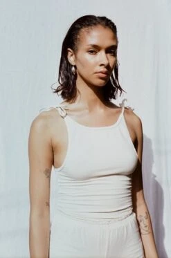 every day, slightly cropped stretchy tank with adjustable shoulder ties. wear front or back. made from 95% milled in the USA organic cotton, 5% spandex.