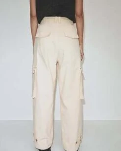corduroy cargo pants with side seam pockets. zip and button fly with drawstring at waist. adjustable button tabs at ankle.
