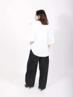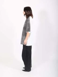 The Oversized T-shirt in Black by MM6 Maison Margiela is a stylish statement piece. Crafted from a soft cotton blend, the t-shirt features an oversized silhouette with a dropped shoulder and longer sleeve length. The washed gray front side of the shirt features MM6 Maison Margiela’s signature numeral logo, while the back of the shirt is all white.