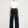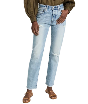 High waisted straight leg in a blue wash with some distressing. Button fly.