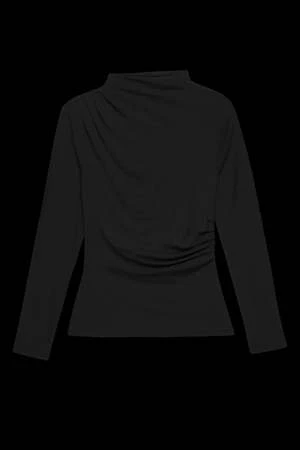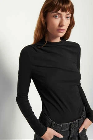 The effortlessly cool older sister of your favorite mock neck tee. Featuring a bottle neck and shoulder and waist tucks for a draped, just-chiseled-out-of-marble silhouette. IYKYK (This one comes in Jet Black.)
