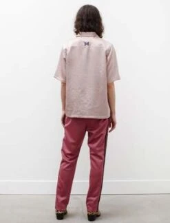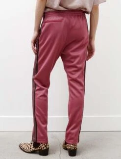 A Needles signature in a perfect dusty pink polyester, these track pants are the perfect balance between luxury and comfort. Detailed with a deep navy ribbon down the leg and the trademark papillon logo embroidered at the hip, this athletic silhouette has a relaxed narrow fit. Finished with zip pockets and an elasticated waist.