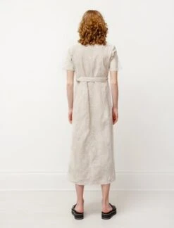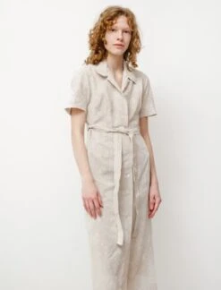 Ideal for spring and summer, this dress is cut from a starchy cotton-linen blend that’s lightweight and breathable, finished with a faded brown stripe throughout. Offering a slim fit, detailed with darts at the waist, peaked lapels and a button down front that make it great for layering.