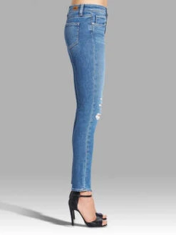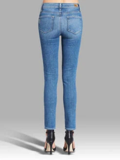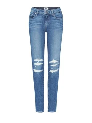 The Paige Skyline Ankle Peg Jean in Liza Destructed are made from a mid blue denim. Featuring light fading on the seams, mirrored rip detailing on the thighs and knees, and tarnished gunmetal hardware, these jeans are made from Paige’s Legacy fabric, and will keep their shape wear after wear.