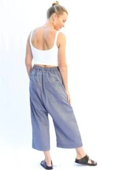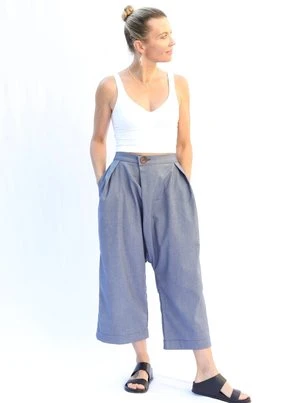 The Eastward Pant is a Japanese-inspired drop-crotch pant with a flattering high waist and generous pockets. Made from soft deadstock chambray, theyre an easy slack that can be the stroke of color in your outfit and coordinate with many patterns.
