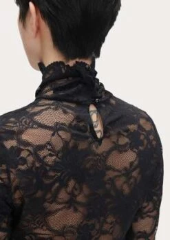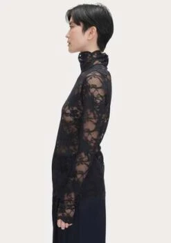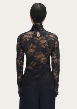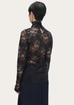 This fitted, long sleeve mockneck top is a classic silhouette from Rachel Comey. Cut in a sheer, lingerie-inspired floral stretch leavers lace with scallop edges. A great layering piece. Keyhole and double button closure at back of neck.