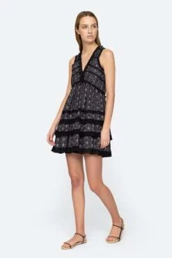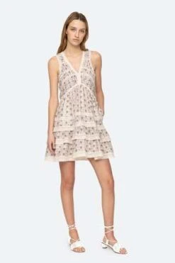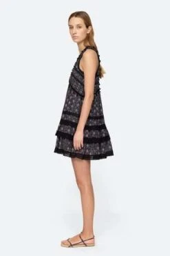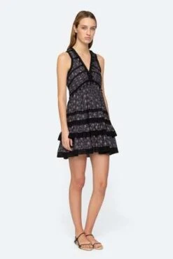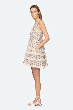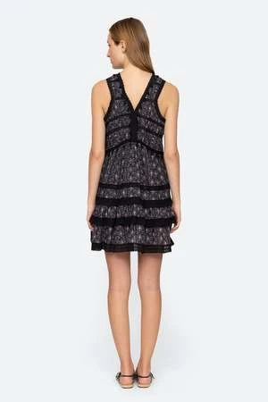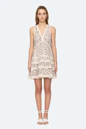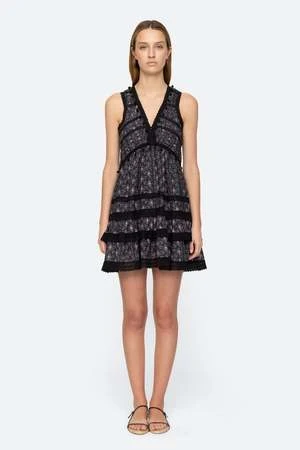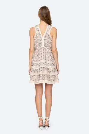The Yvonne floral print sleeveless dress features a tiered skirt, lace and pleated detailing throughout, pom-pom accents and mini silhouette.