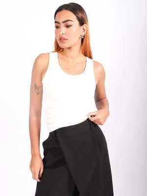 This Asymmetric Tank Top by Sean Suen offers a unique touch to a classic rib knit silhouette. The asymmetric hem creates an interesting ruching detail, while the tank top remains light and comfortable to wear. An ideal pick to add a bit of edge to your wardrobe.