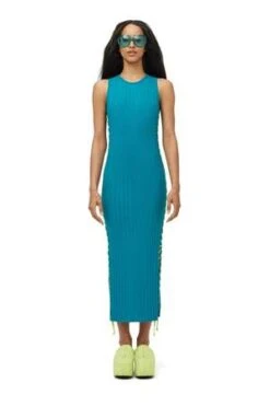 Halter midi dress in our custom SIMON MILLER rib fabric with whipstich detail and slits on side seams.