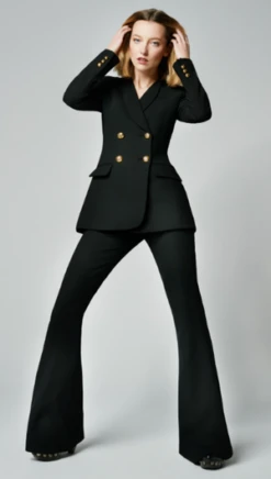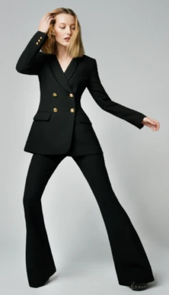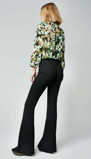 Style Notes: The stretch fabrication is seasonless and can be worn with its coordinating blazer as a statement-making, directional suit. Details: Mid-rise and full-length, this stretch pant is fitted through the waist, hips and thighs, and features an elongating bootcut silhouette. Color: Black Pique Size: Model wears a size 24 jean, weighs 120 lbs and is wearing size 00 featuring a 34″ inseam. Please use the Size Guide to determine your size. Content + Care: 69% Polyester, 28% Viscose, 3% Elastane. Dry Clean Only. Sustainability: The viscose fibres are Eco-Vero Certified (from botanical origin). Made in Canada