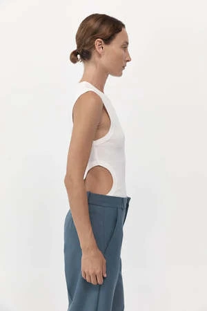 the organic cotton cut out tank plays with asymmetric negative space while maintaining all the elements of a tried-and-true classic. features crew neckline and cut out side detail