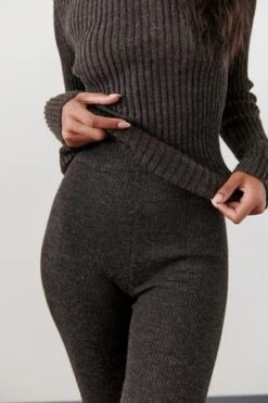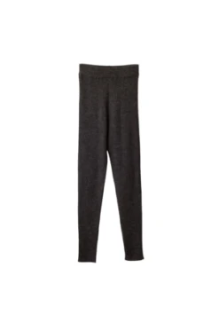 Delicate, fine gauge 100% baby alpaca yarn knit in a substantial and stretchy rib. Wide elastic waistband sits just below natural waist for maximum comfort. Fitted, tapered leg.