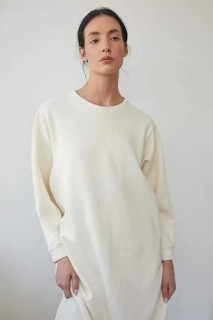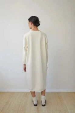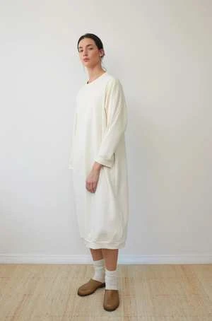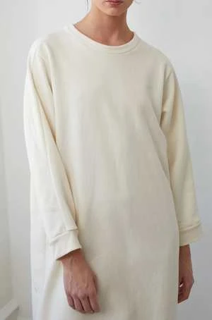 An oversized, dress version of Wol Hide’s fan favorite Easy Sweatshirt. Mid-length with their signature shoulder gusset and seam detail and side seam pockets. Wide rib hem at bottom and rib cuff at sleeve. Made of 100% USA grown and sewn organic cotton fleece fabric, ultra soft and fuzzy inside.